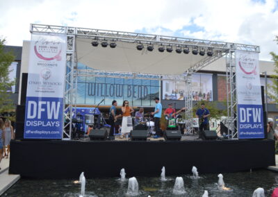 Other companies own staging equipment in Texas, but few of them have the experience that In Depth Events does in creating custom structures. Of course, we provide load-bearing concert and festival stage and roof systems for outdoor environments. We provide commencement stages, runways, and stage thrusts for extensions over seating or pews. However, this is only the tip of the iceberg regarding our staging rental services. We build choral, audience risers, press, and photo risers. We create custom rental stages with acrylic surfaces and white and round stages. We pioneered the lit stage, providing LED-lighted surfaces for dance floors and fashion runways. We even provide rolling stages for sporting events and stages over water using our pool cover systems. Whatever your live event staging needs, we’ve been there and can bring our experience to you. Take a look at the staging rental services we offer below!